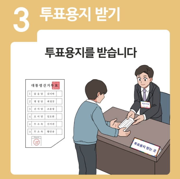 - 투표용지 수령 – 주소지 기준 후보자 정보가 담긴 용지 제공