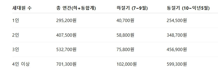 세대원 수와 하절기, 동절기에 따라 지원금액이 다르니 이미지 참고 바랍니다